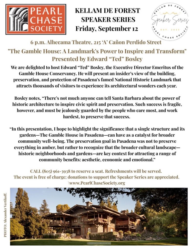 The Pearl Chase Society is pleased to announce the 2025 Kellam de Forest Speaker series, established in 2023, as we continue the legacy of one of its most illustrious founding members, Kellam de Forest. His dedication to historic preservation in Santa Barbara is legendary and inspirational.